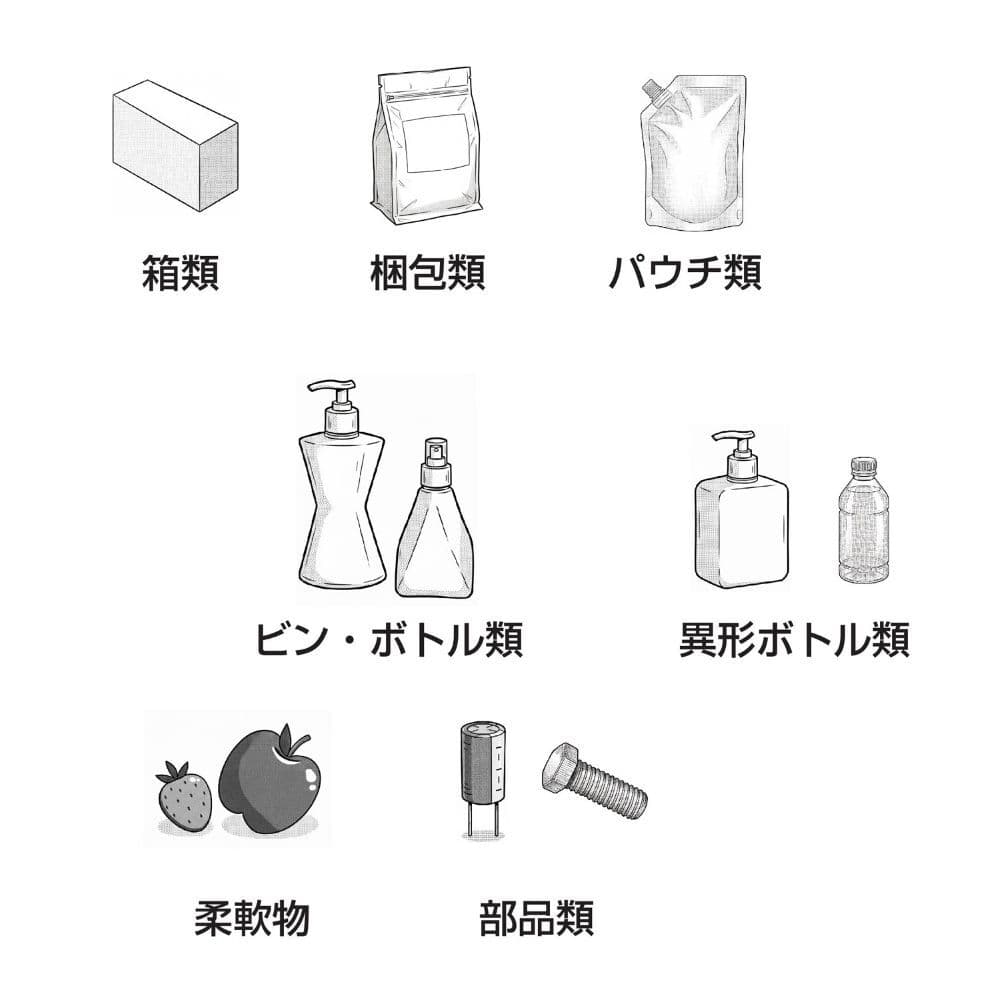 箱類・梱包類・パウチ類・ビンボトル類・異形ボトル類・柔軟物・部品類の把持に対応可能です。